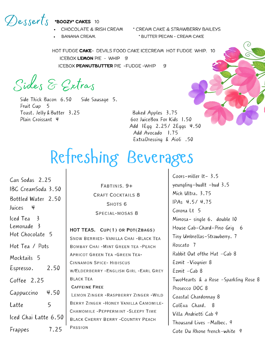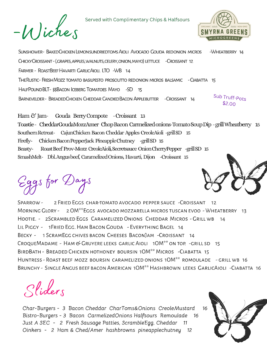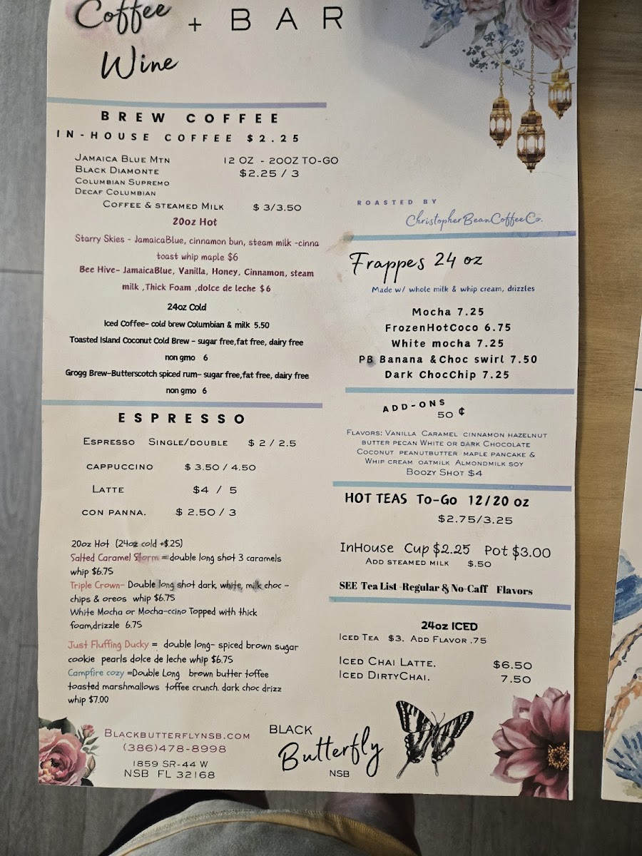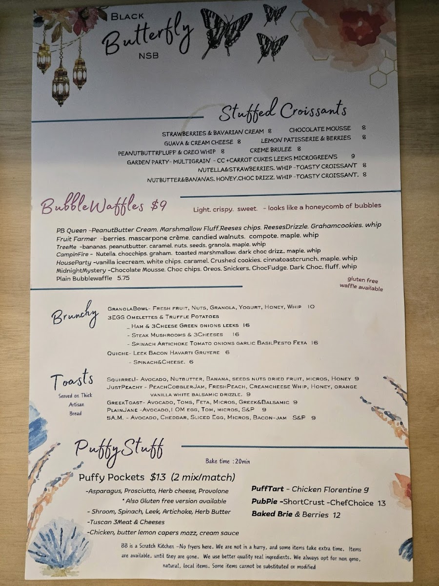 The menu at Black Butterfly NSB offers a delightful variety of dishes, catering to diverse tastes and cravings. For those in the mood for something light, the Wiches section features options like the Sunshower and the Chicky Croissant, each offering unique flavors. Heartier choices include the Halfpound BLT and the Barnevelder. If you’re craving a savory bite, the Sliders like Char-Burgers and Bistro-Burgers are must-tries. For a sweet treat, their Hot Fudge Cake and Icebox Lemon Pie provide a satisfying end to your meal. There’s also an array of refreshing beverages, such as IBC Cream Soda and Iced Tea, complemented by their soothing selection of Hot Teas, including Bombay Chai and Apricot Green Tea. For those looking for something more substantial, dishes like the Steakout Skillet and Magical Forest Flatbread are packed with flavor. Don’t miss out on the Stuffed Croissants, particularly the indulgent Chocolate Mousse and Guava & Cream Cheese varieties. For breakfast lovers, the Eggs For Days dishes like Becky and Birdbath hit the spot. Whether you're in the mood for a light bite or a full meal, Black Butterfly's menu provides a wide range of creative and satisfying options that are perfect for any time of day.